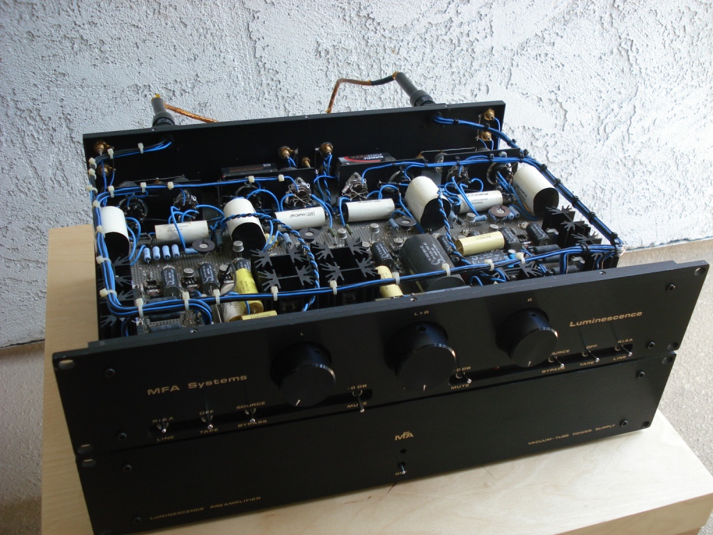 Reading many posts on your site has caused me to think about my system. I'm facinated by horn systems and have heard several that were compelling in key respects, the ability to use a DSET such as your Melquiades amp being one. One the subject of a 'final' phonostage, my own is one of the three MFA Systems MC Reference prototypes built for CES in Las Vegas. This one, housed in an MFA Luminescence chassis is the ultimate of the three. It differs from the production version of the MC Reference in several ways. It is hard wired throughout and uses ECC88s, 12AX7s and 12AU7/AT7. The phono stage is battery-powered. I've included some photos for you to see. It is currently in need if repair. Bob Hovland took a quick look at it and identified two caps that needed to be replaced. they have been removed so you may notice them missing in the photo. This particular phonostage has the magic you talk about.