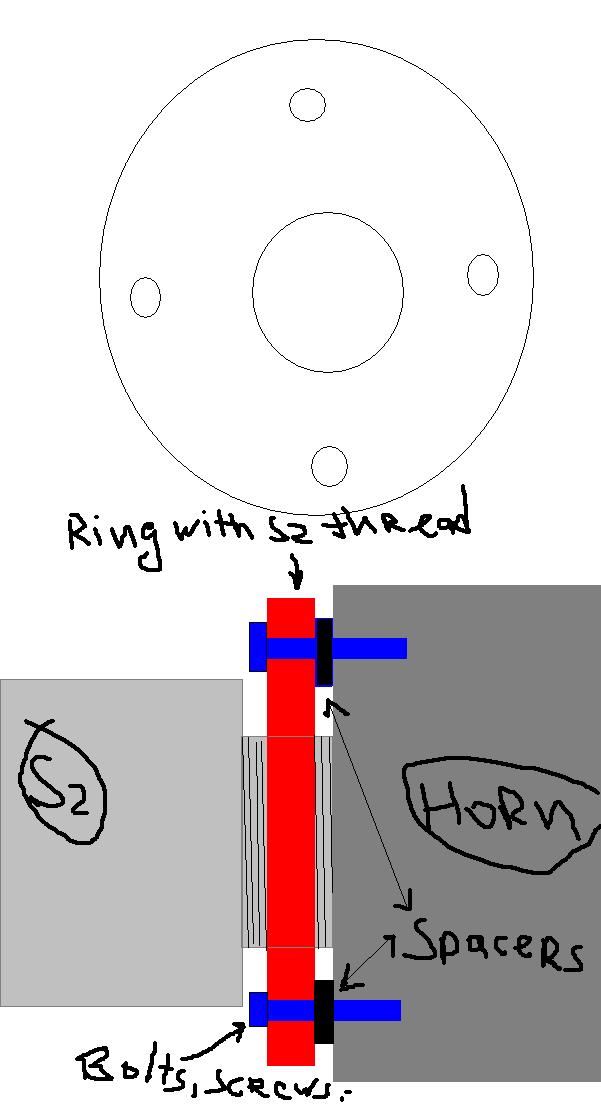 If you wish you might use my method that I “invented” or my Fundamental Chanel. My MF Chanel horn uses a sophisticated harness with centering functionality but in but Fundamental Chanel uses a very simple “extended ring” method. It us chip, it would cost very little any machinist to do it. I think I paid $100 for a pair of rings. Lake the rings a half or 2/3 of the size of your S2 driver thread. All the rest is visible on the drawing belle. The only pain is to co-axis the horn and the driver… But wish you it to be the only pain you have.